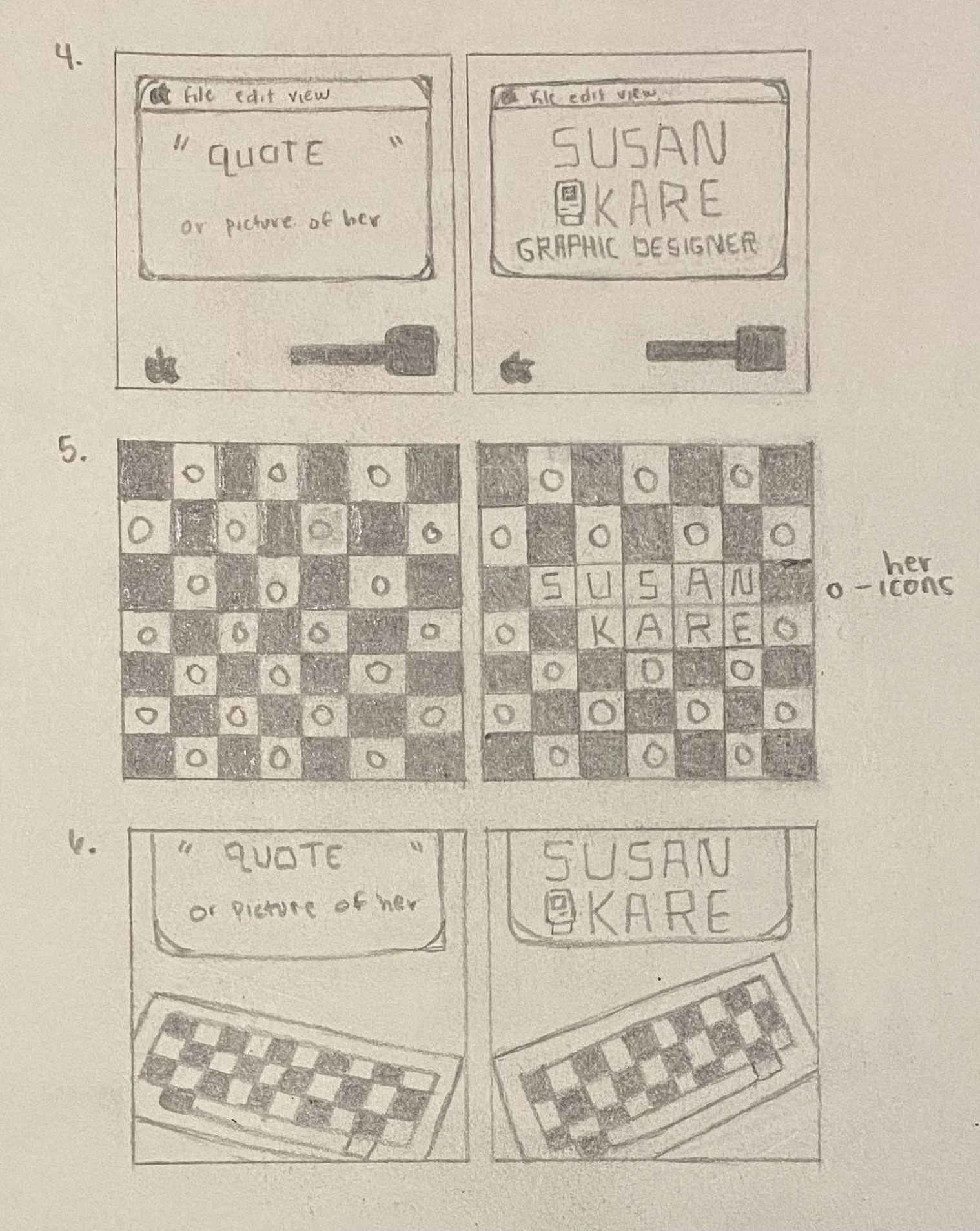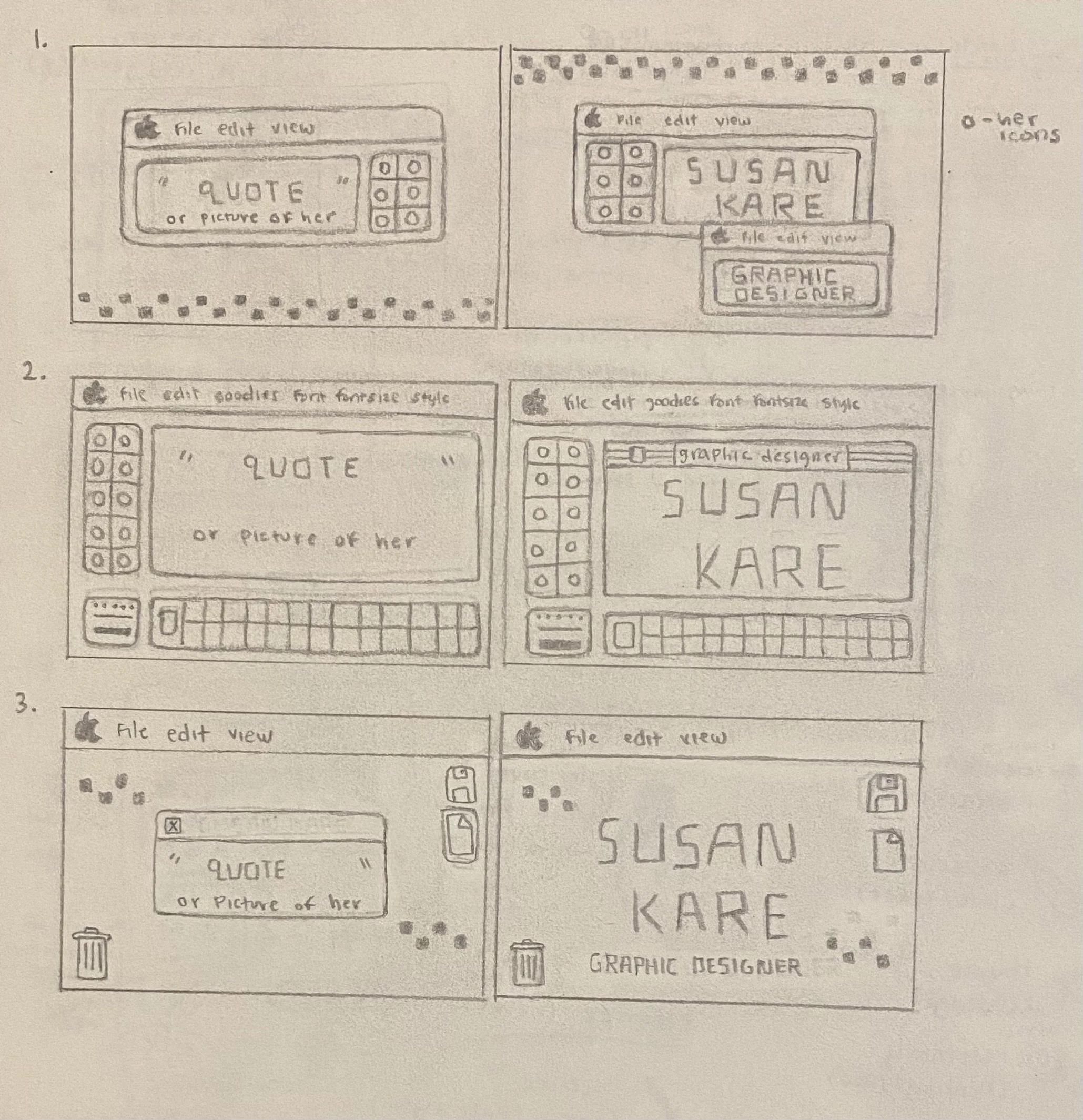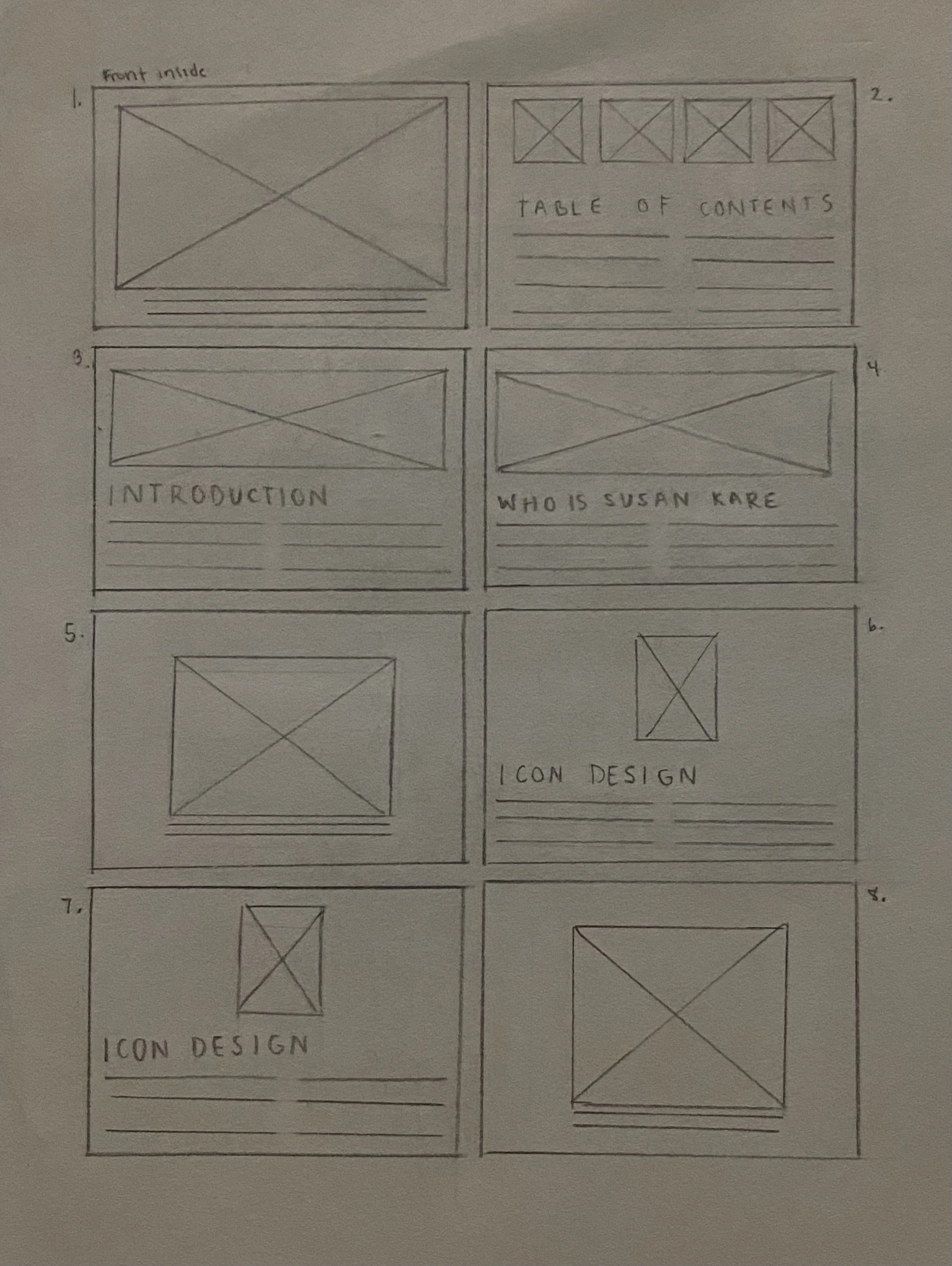 I sketched front and back cover ideas based off the moodboards and my knowledge from researching Susan Kare, and just trying to show the pixel aesthetic I was going for. I also sketched layout concepts for the inside pages of the booklet.